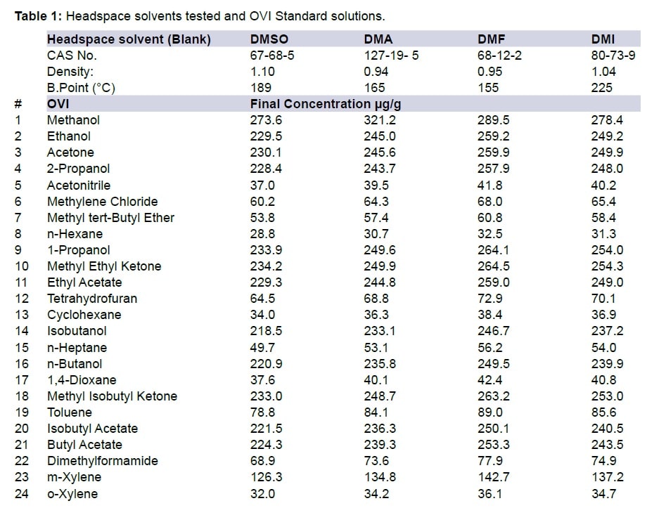 Con estos datos se concluye que los disolventes de grado Headspace de Biosolve DMA, DMF, DMI y DMSO son compatibles y ofrecen toda la garantía para la detección de OVI con la técnica Headspace-GC. A esto hay que añadirle que son totalmente puros y no muestran picos de interferencia importantes en una amplia gama de análisis de disolventes residuales comúnmente usados en GC y que son disolventes adecuados para el análisis OVI tal y como se describe en los métodos ICH, USP y EP.